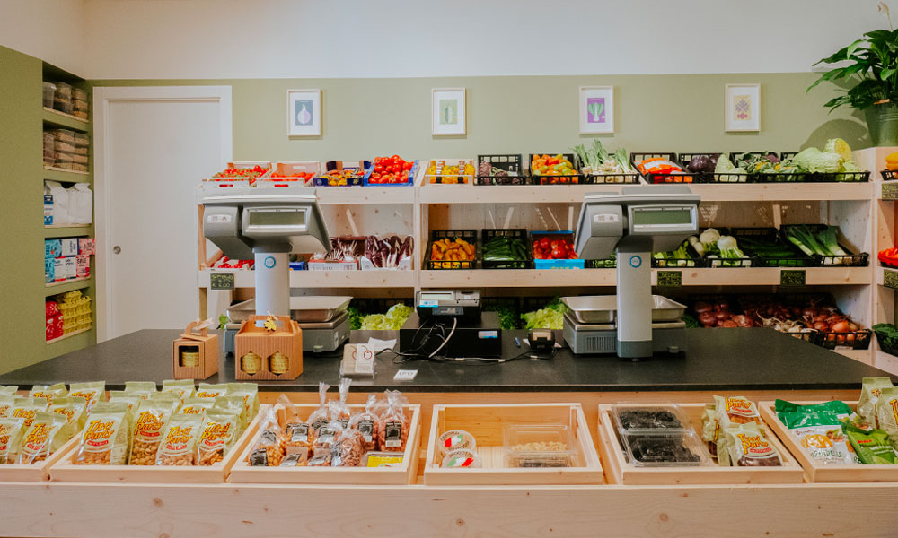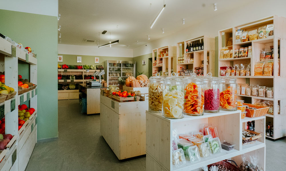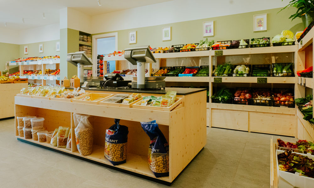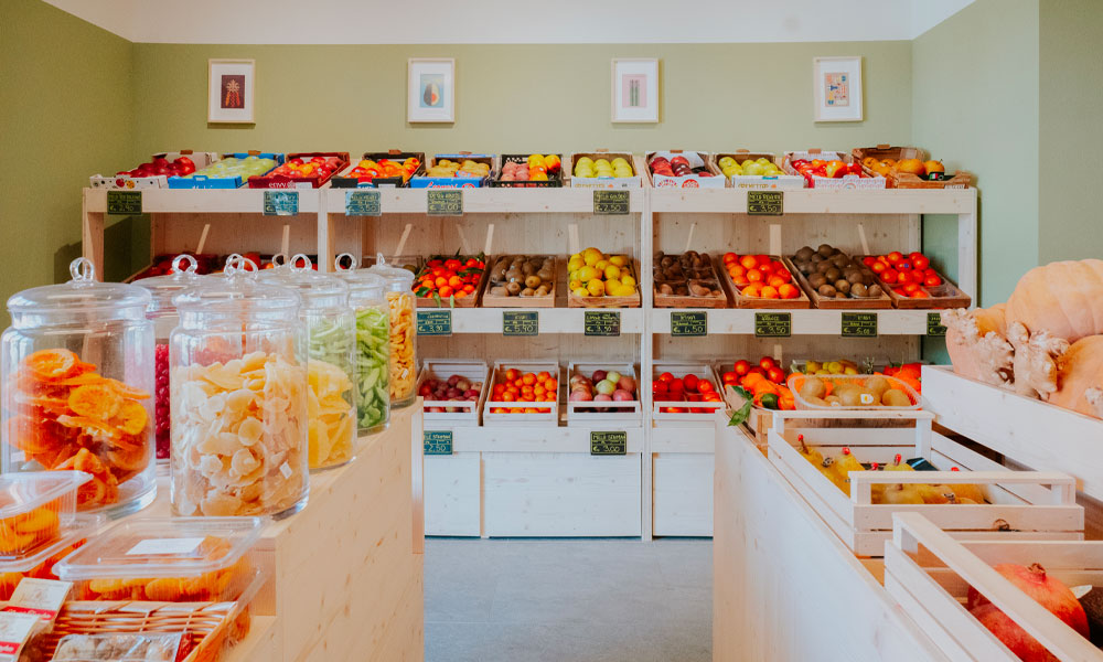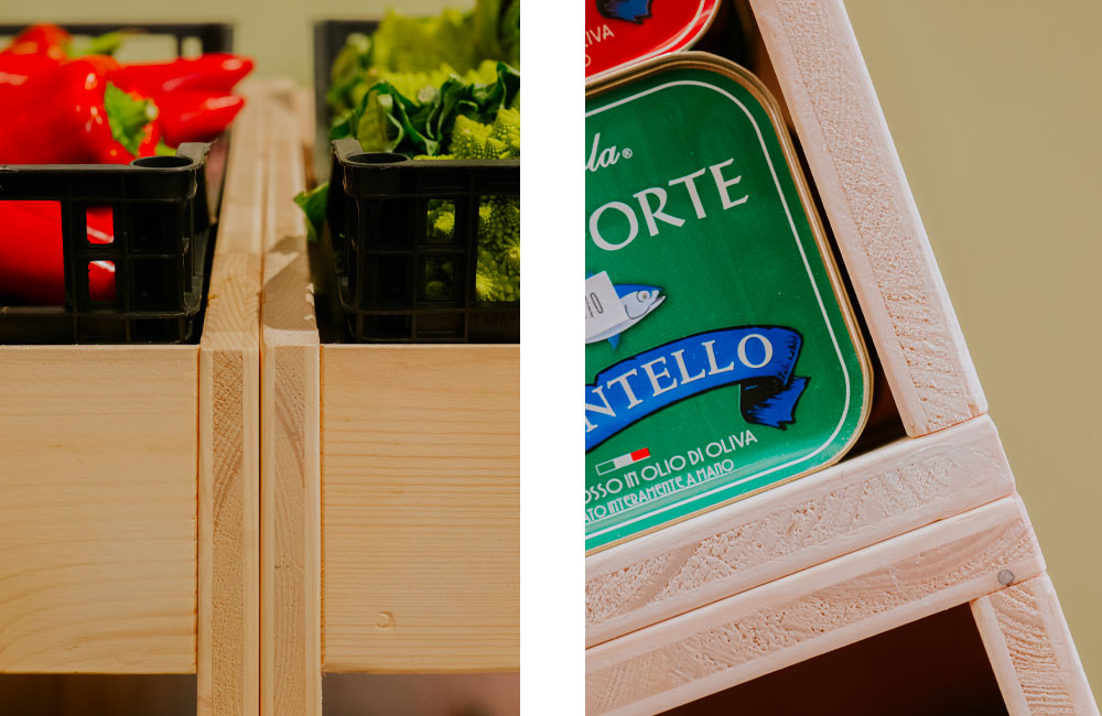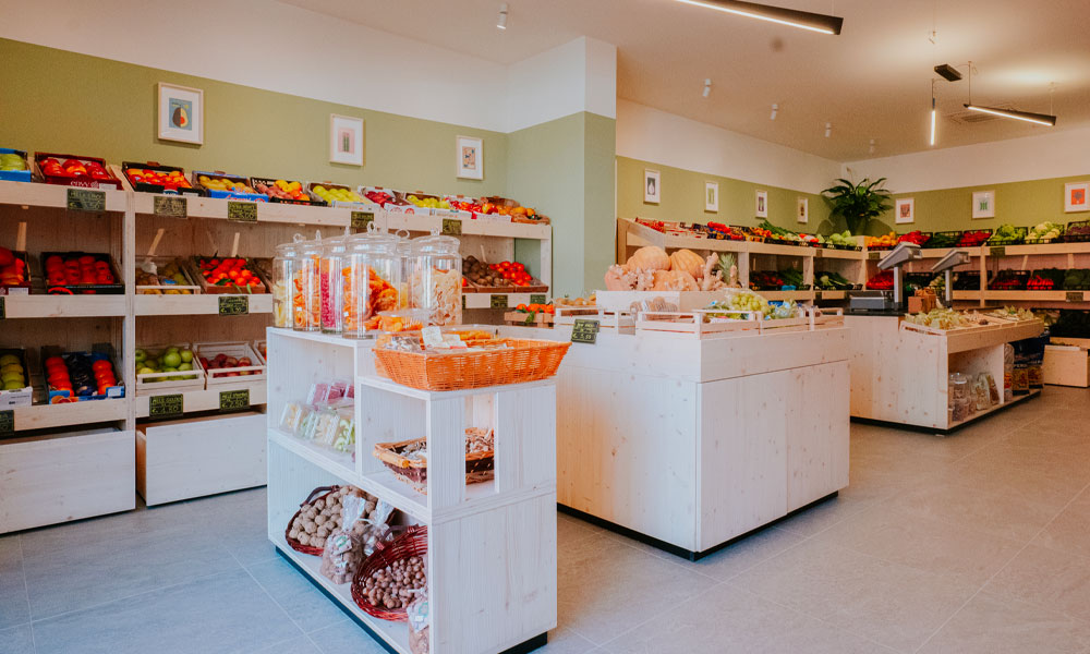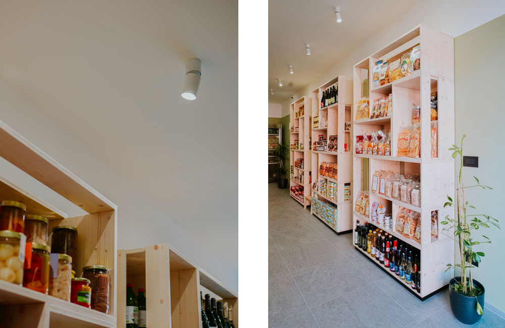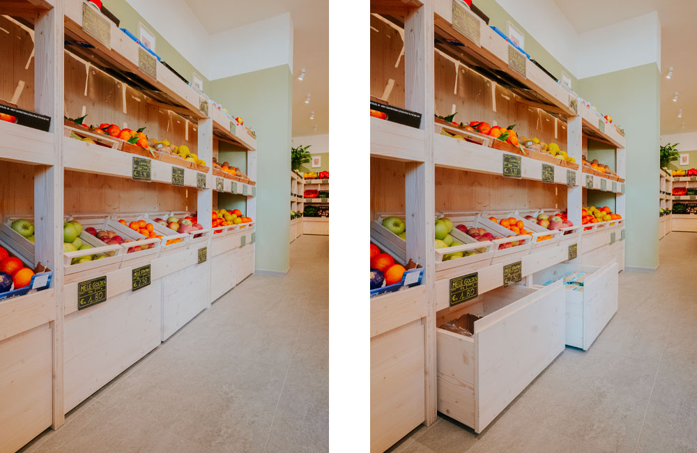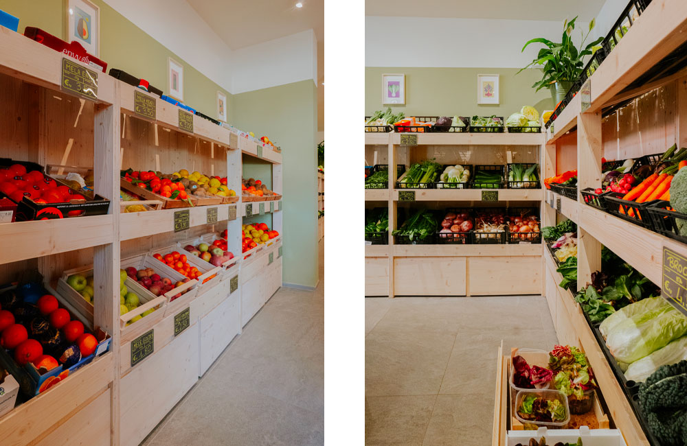 Completa ristrutturazione di un negozio di frutta e verdura per il quale è stato studiato un nuovo layout più funzionale e un sistema di arredi in legno modulari realizzati su disegno in grado di migliorare e valorizzare l’esposizione della merce come gli scaffali dei prodotti freschi con cassettoni a terra che moltiplicano lo spazio espositivo. Legno chiaro, luce puntuale e un verde neutro alle pareti sono gli elementi di un progetto di interni fresco e minimale studiato nei minimi dettagli.